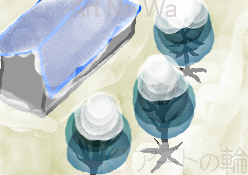 雪が降ります。寒さは冬です。窓の外からではなく空からの想像目線です。
