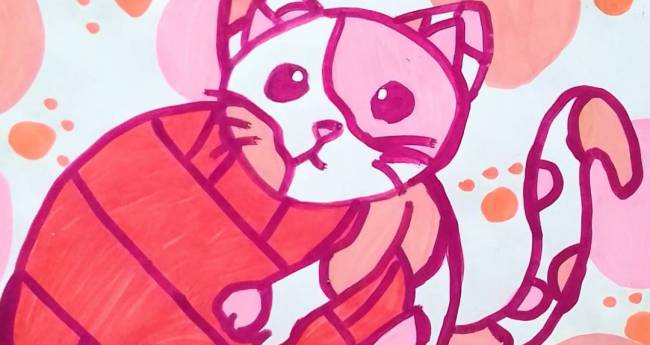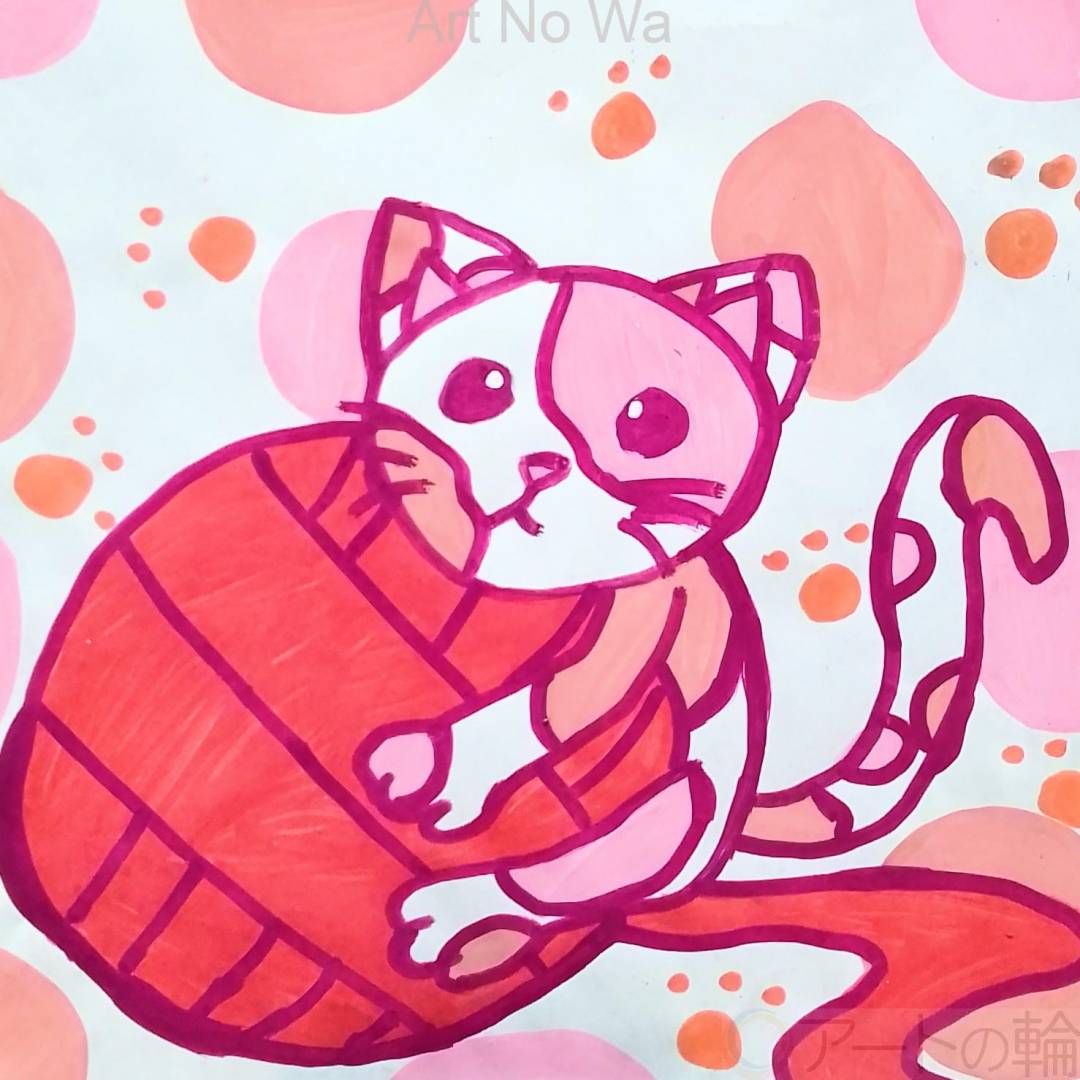 赤い毛糸と一緒にゴロゴロとくつろいでいる猫を描いてみました。