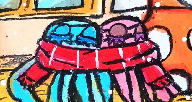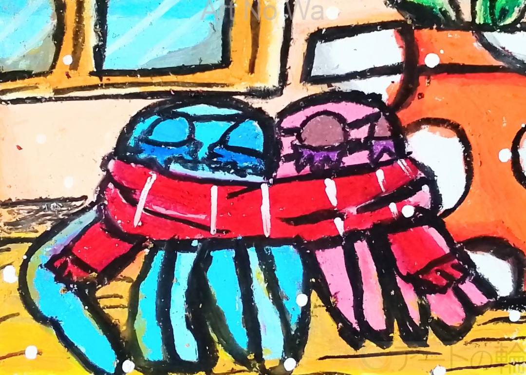 大きなマフラーをして休んでいる2匹のクラゲを描いてみました。