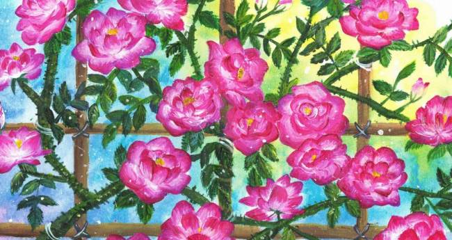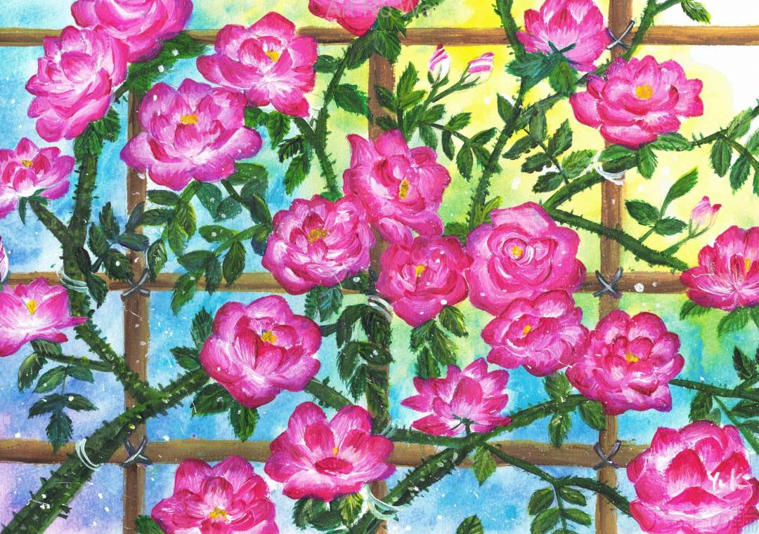 支柱に這った薔薇が明るい光の元、まるで輝いているかの様に美しく咲いています。明るい気持ちになれる様に、心を和ませる。そんな想いを込めました。