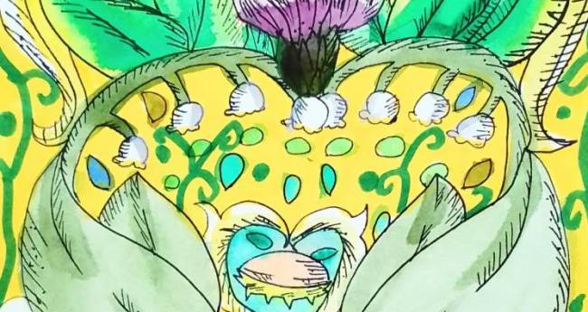 幸せを願うようにハート形で包み込んでいる春の花を描いてみました。チューリップもアザミもスズランも花言葉が幸せや愛、安心などが関係する花言葉だったので、モチーフに合わせて描いてみました。