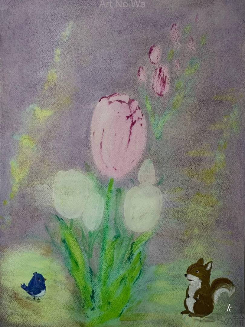 チューリップが咲くのを想像して春を待つ小さな動物たち。
