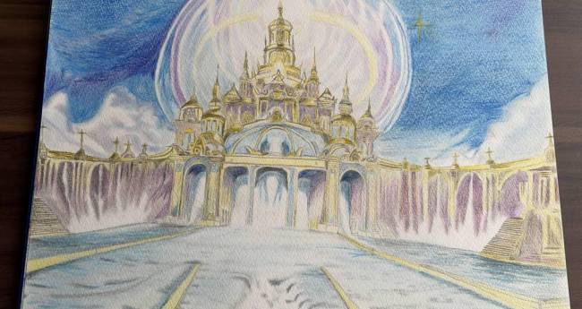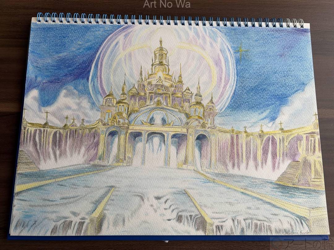 解放のイメージして空想画を描きました。鉛筆で下書きして色鉛筆で魂を込めました。