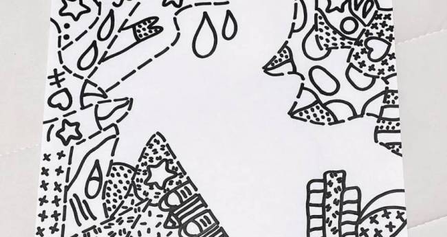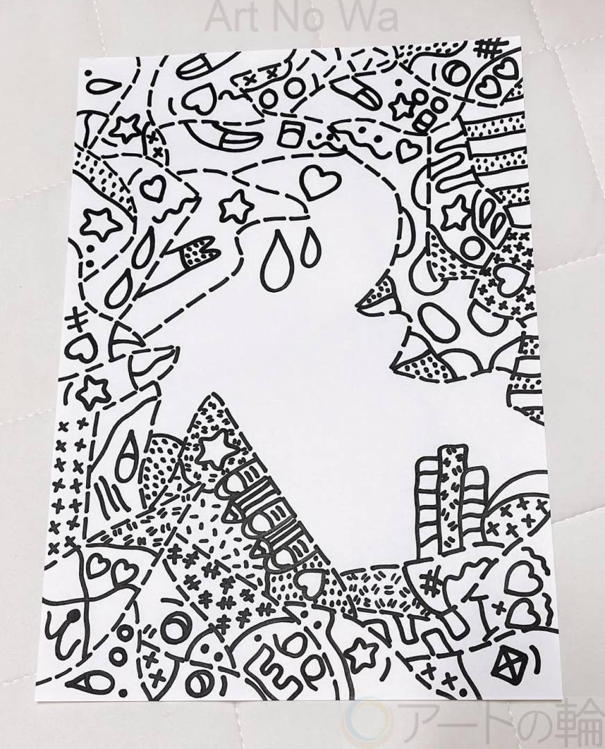 真ん中の鳥に空白を作ったのが1番のポイントです。その周りには、ミニミニの小さな動物・海の生き物などがいます。初めて真ん中に空白を入れた絵を描いてみました。バランスの良い絵が完成して良かったです。これからも空白のある絵を描いてシリーズ化してみたいです。