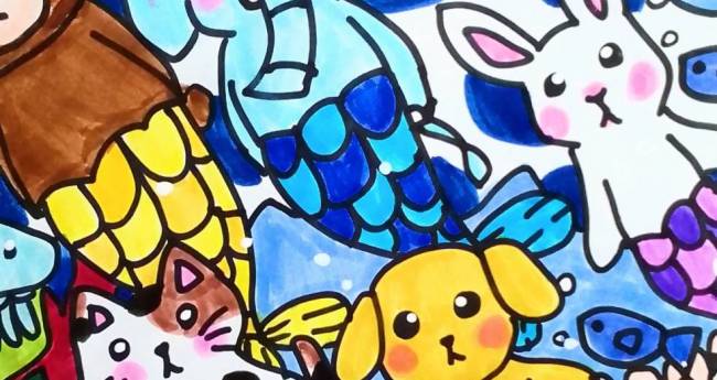 海の中を優雅に泳いでいる人魚の動物達を描いてみました。