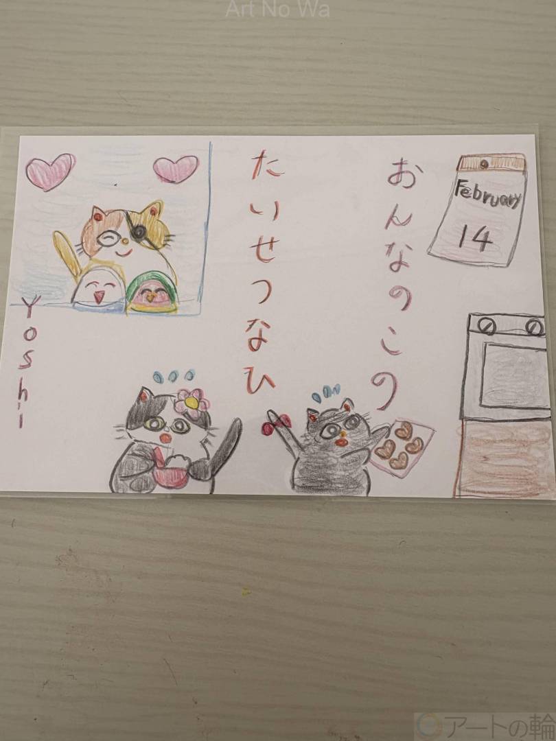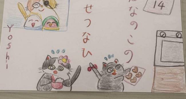 バレンタインの日に黒ネコのミューちゃんとハチワレネコちゃちゃはランちゃんとチェリーと片目のマサムネに頑張ってチョコクッキーを作りました。