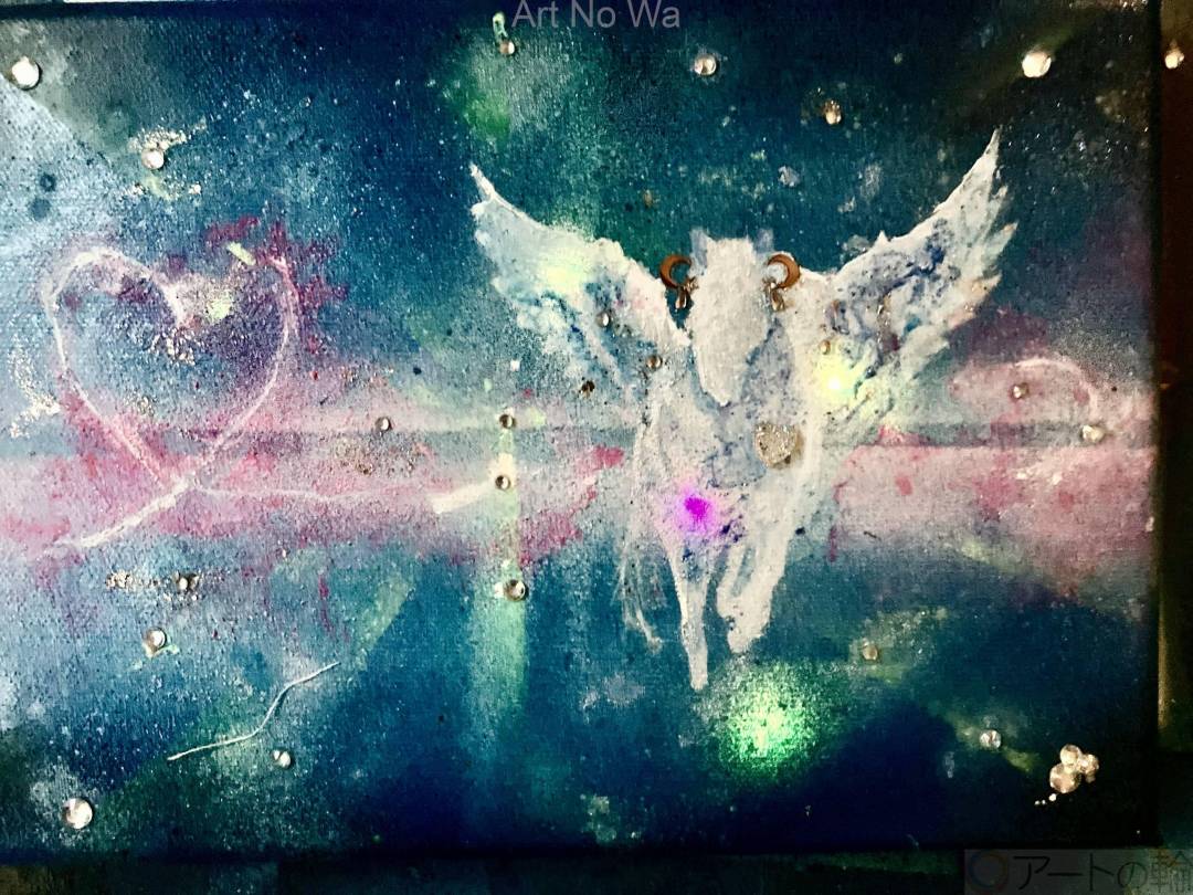 夜空を駆ける白いペガサスを、光の帯とハートの輝きで包み込むように描きました。 ブルー・パープル・ピンクの宇宙色を重ね、ラインストーンや装飾素材できらめきを加えています。 近くで見ると細かな質感や光の反射も楽しめる作品です。ご感想いただけると嬉しいです。