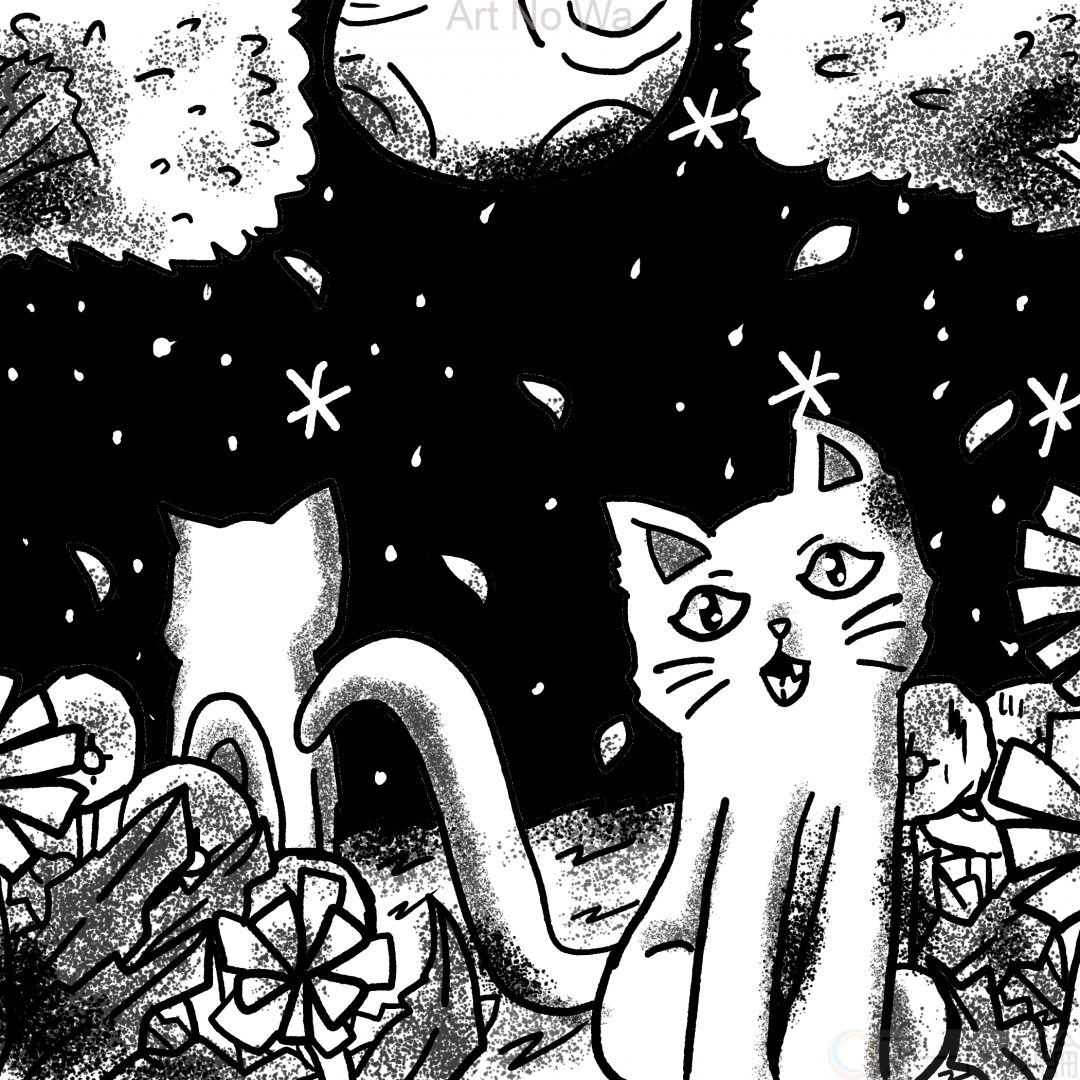満月の日の夜空の春風に靡いている白猫達を描いてみました。