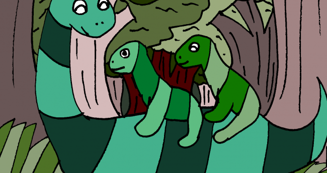 親子で森の中を散歩している恐竜を描いてみました。