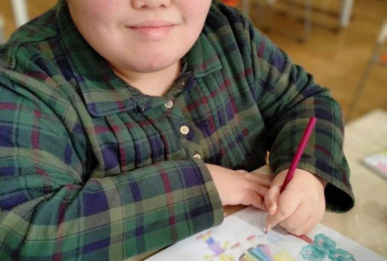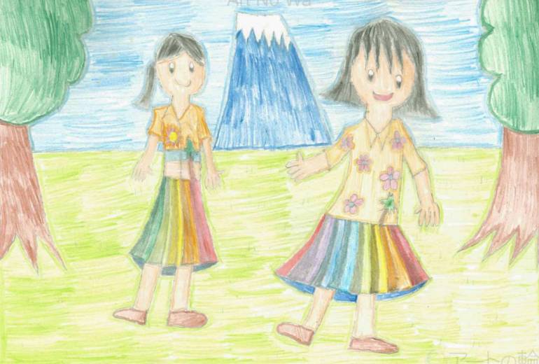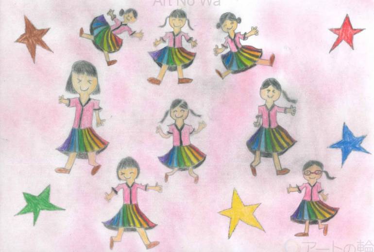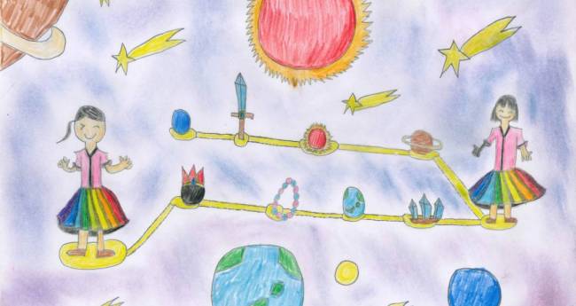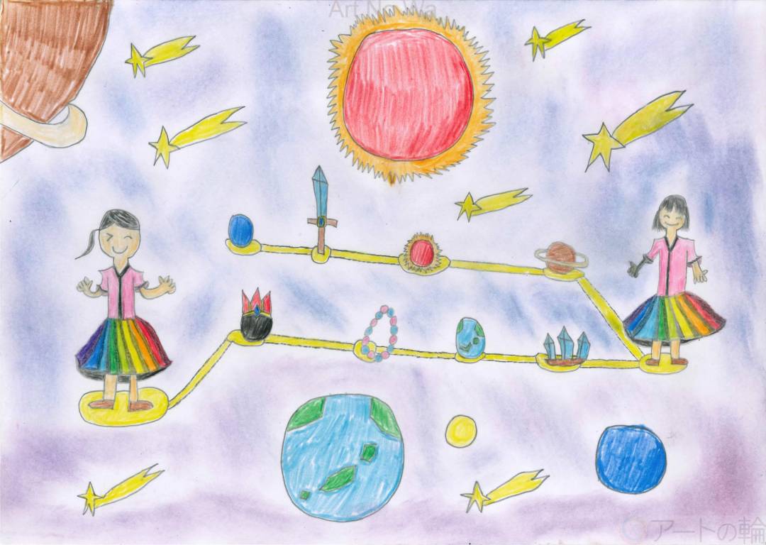画面を横断する黄金のラインは、まるで一歩ずつ進んでいく「すごろく」の道や、ゲームの「ステージ」を連想させます。道中に配置された剣や宝石、そして天体たちは、冒険を進めるごとに現れる大切なアイテムのようです。虹色のスカートをまとった登場人物たちは、この広い宇宙のステージを彩る主人公。このマップは、観る人を「次はどんな出会いがあるだろう」という未知への期待感で満たしてくれます。それぞれのモチーフに込められた遊び心と、丁寧に塗り分けられた色彩のハーモニーが、自分だけの物語を歩む勇気を与えてくれるような、躍動感あふれる作品です。