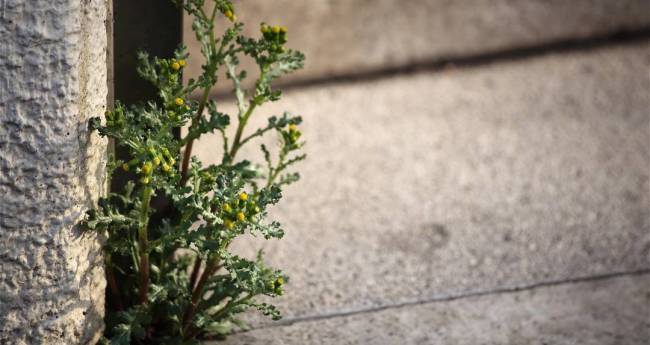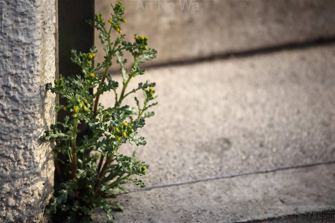 駅の柱脇に寄りかかるように咲いたノボロギクです