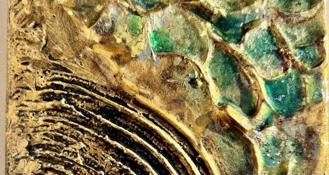 ここちよい金の手触り、過去の時間の匂いや手触り、時間を経た美しさを表現。画材:リキテックスモデリングペースト、金箔、油煙墨、ダニエルスミス透明水彩、グロスポリマーメディウム、ジェルメディウム