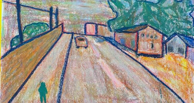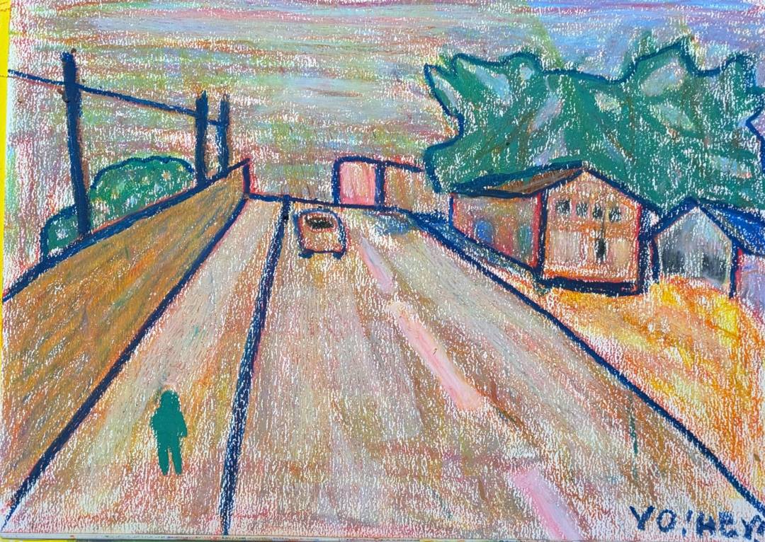 冬の晴れた日に撮った写真をクレヨンで描きました