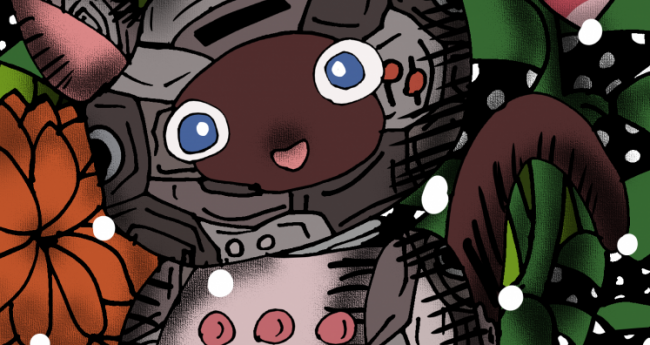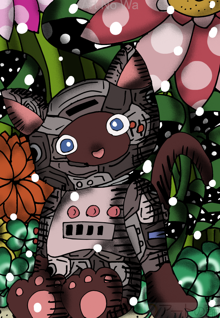 花や草が生えている下のあたりで休んでいる壊れかけのシャム猫ロボットを描いてみました。