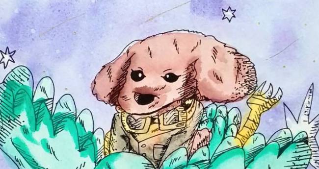 夜空へ冒険家の犬を乗せて飛んでいる大きな鳥を描いてみました。
