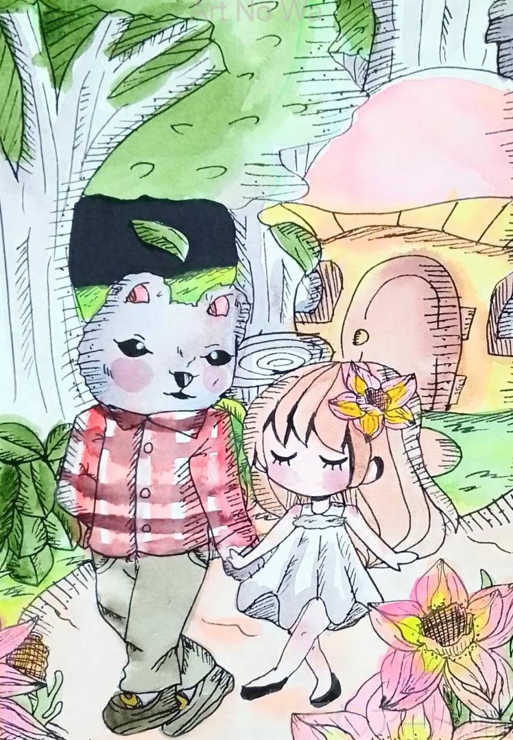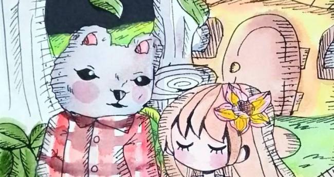 セルリア・フロリダという植物の「ほのかな思幕」という花言葉をテーマに森の中をデートしている熊と女性を描いてみました。