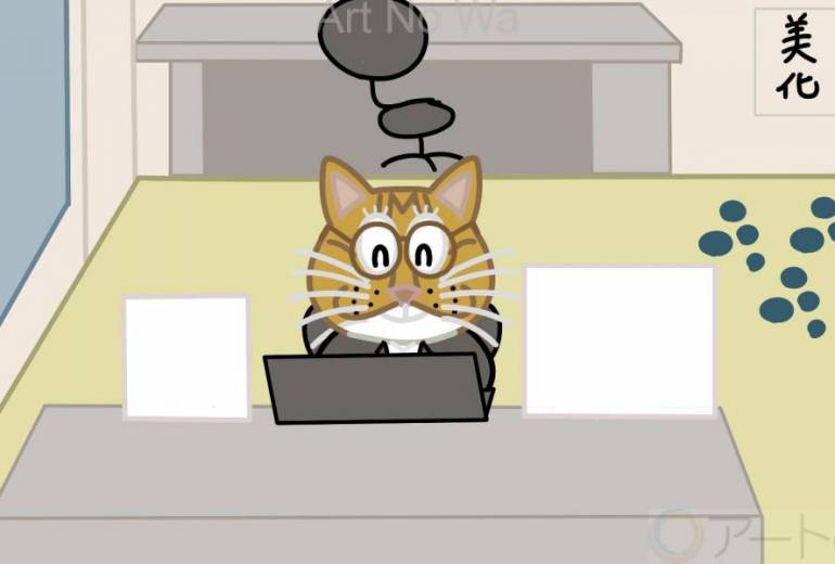 猫が会社のオフィスで働いている所