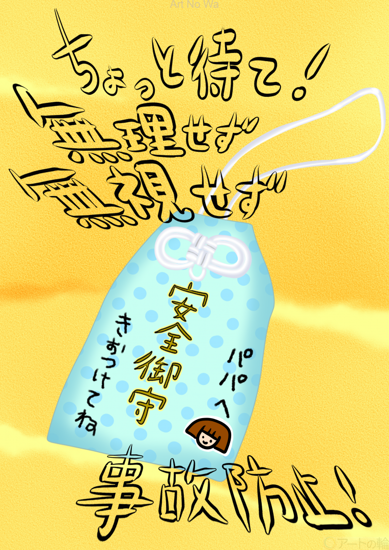 皆様の安全を願って、御守りを描きました。娘が父に作ったおまもりです。シールがチャームポイントになっています。宜しくお願いいたします。