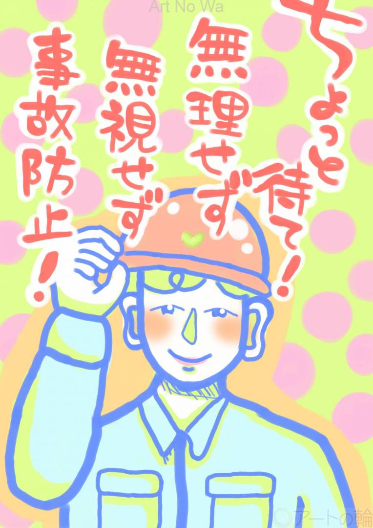 シンプルで目立つように。 表情を爽やかに、文字がすぐはいるようにしました。ヘルメットのハートは誠実で真心を持ってお仕事ができますように。また、にこやかに気持ちよくできるように。このポスターがあったらパワーをもらえるような絵にしたかったです。