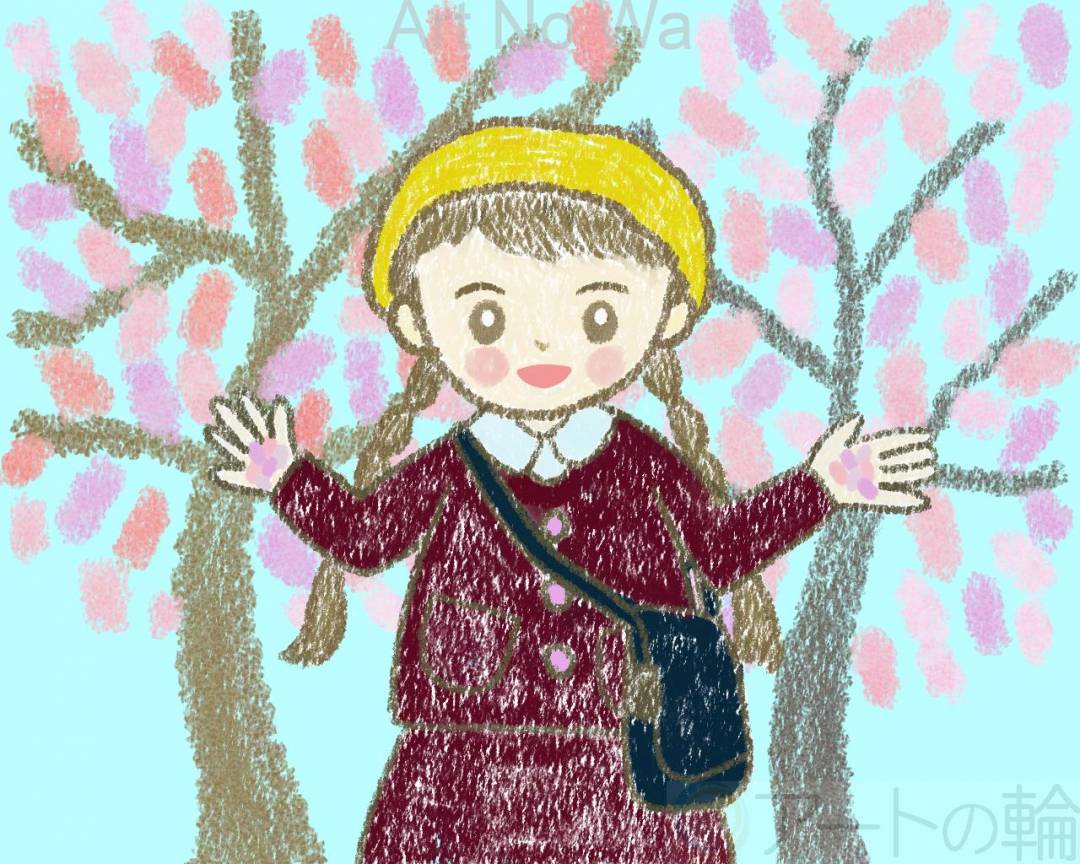 想像の幼稚園女子を描きました。今、季節は春なので春ちゃんと名付け、満開の桜と一緒に描きました。さっそく、想像の桜の花びらをひろってご満悦です。