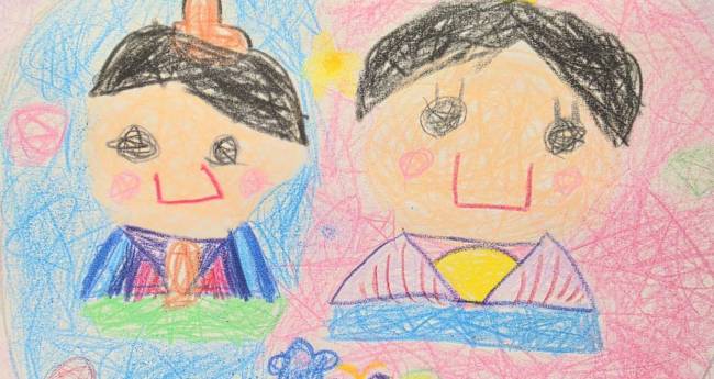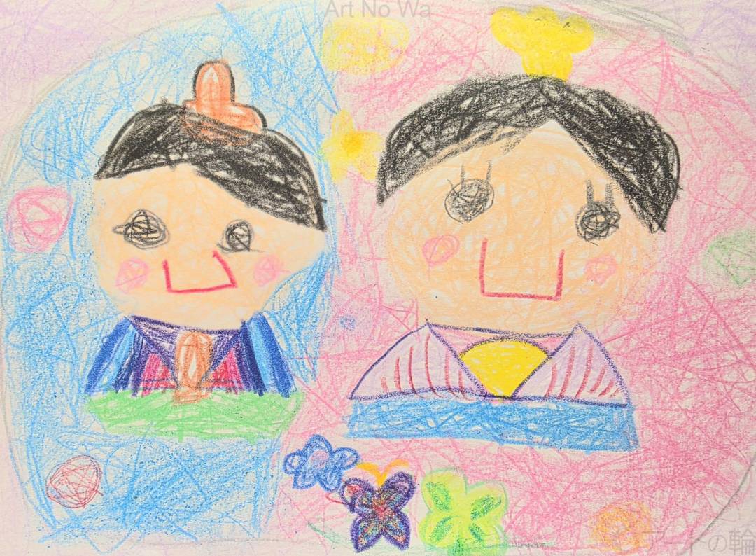 薄い色をいっぱい使ってかわいいおひな様とおだいり様を描いたよ