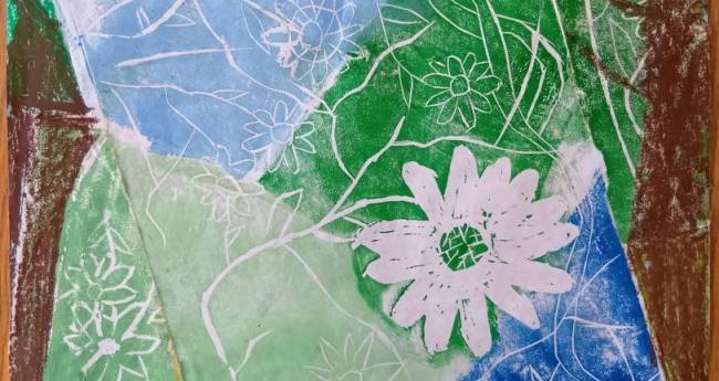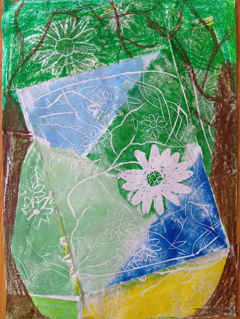 森の中で木や花を見つめている様子をかいたのでよく見てほしいです。