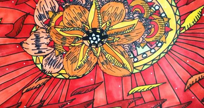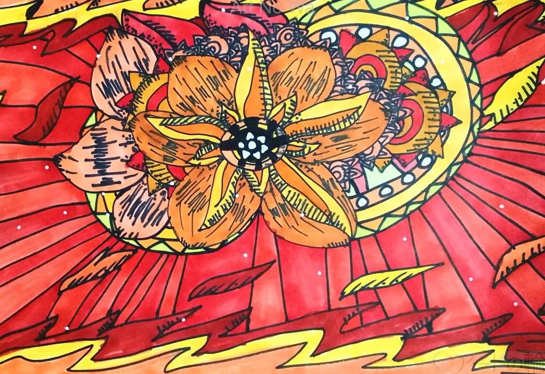 赤く燃え上がっている情熱的な太陽を描いてみました。