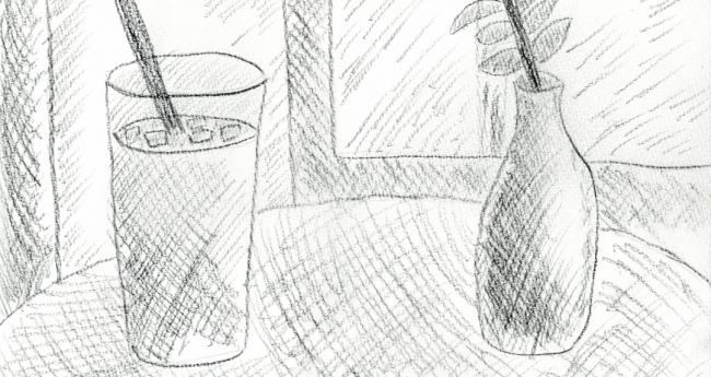 木炭で描いた山と川