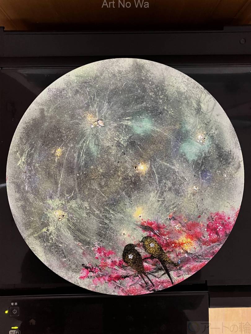 満天の星々が広がる夜空の中、そっと寄り添う二羽の鳥を描きました。 宇宙の静けさと、花の温もりが交差する瞬間を表現しています。 見る人の心に、やさしい灯りがともるよう願いを込めて制作しました。