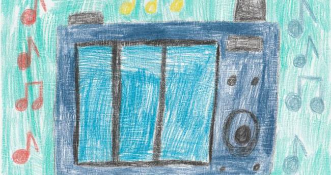 カラフルな背景イメージで青色のデジタルカメラを描きました