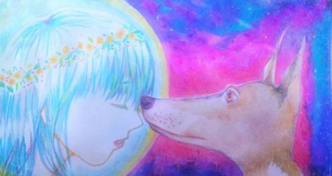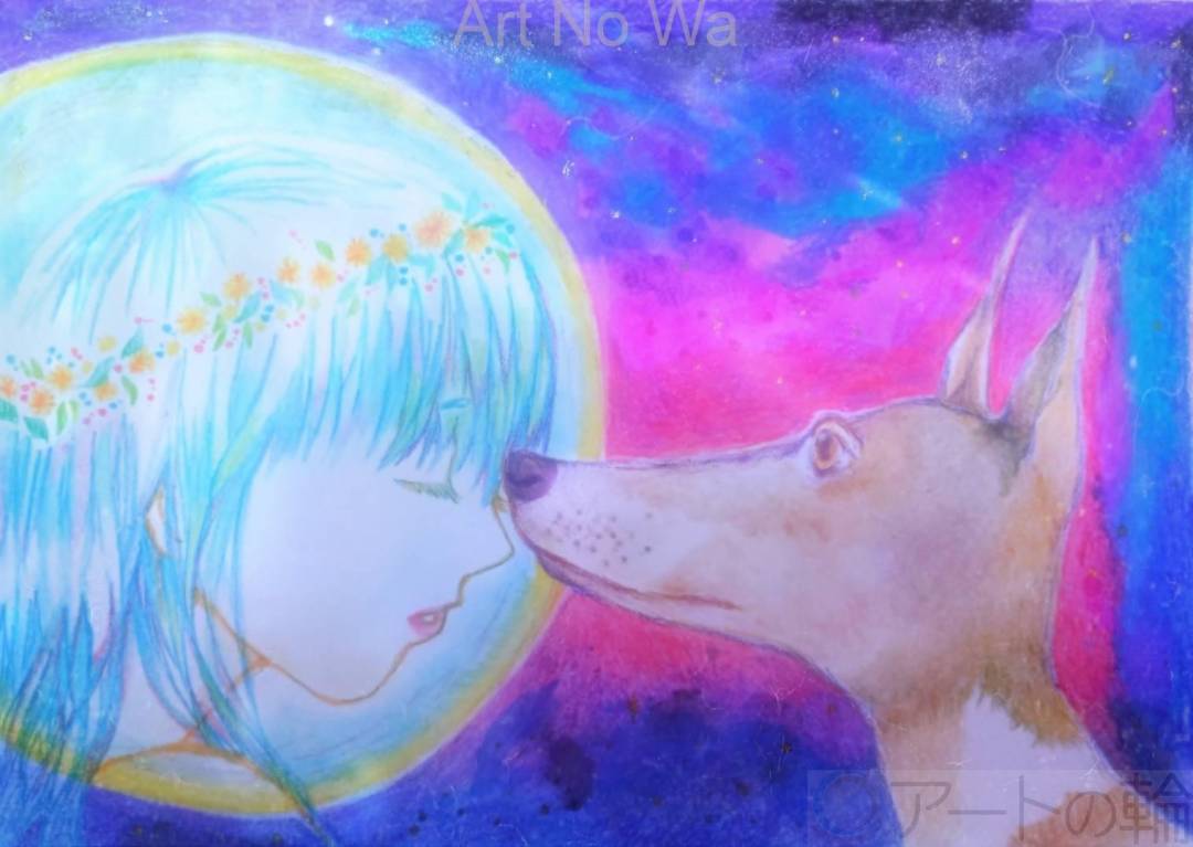 先日行ったお店でグレーハウンドに額をすりすりされて、とてもあたたかく穏やかな気持ちになりました。 その時に感じた穏やかで満たされた想いに地球が包まれ、さらに宇宙空間にもそんな愛が広がっていくことをイメージして描きました