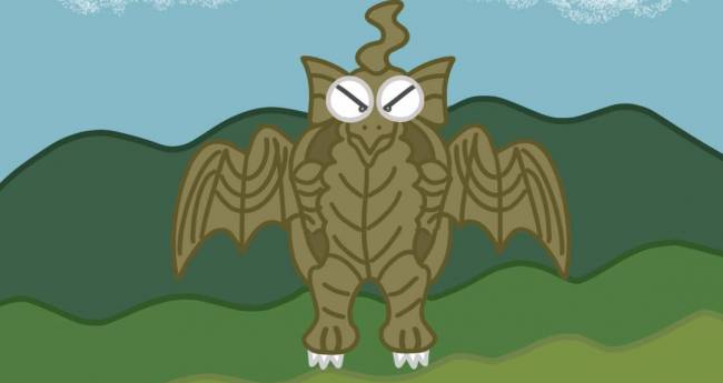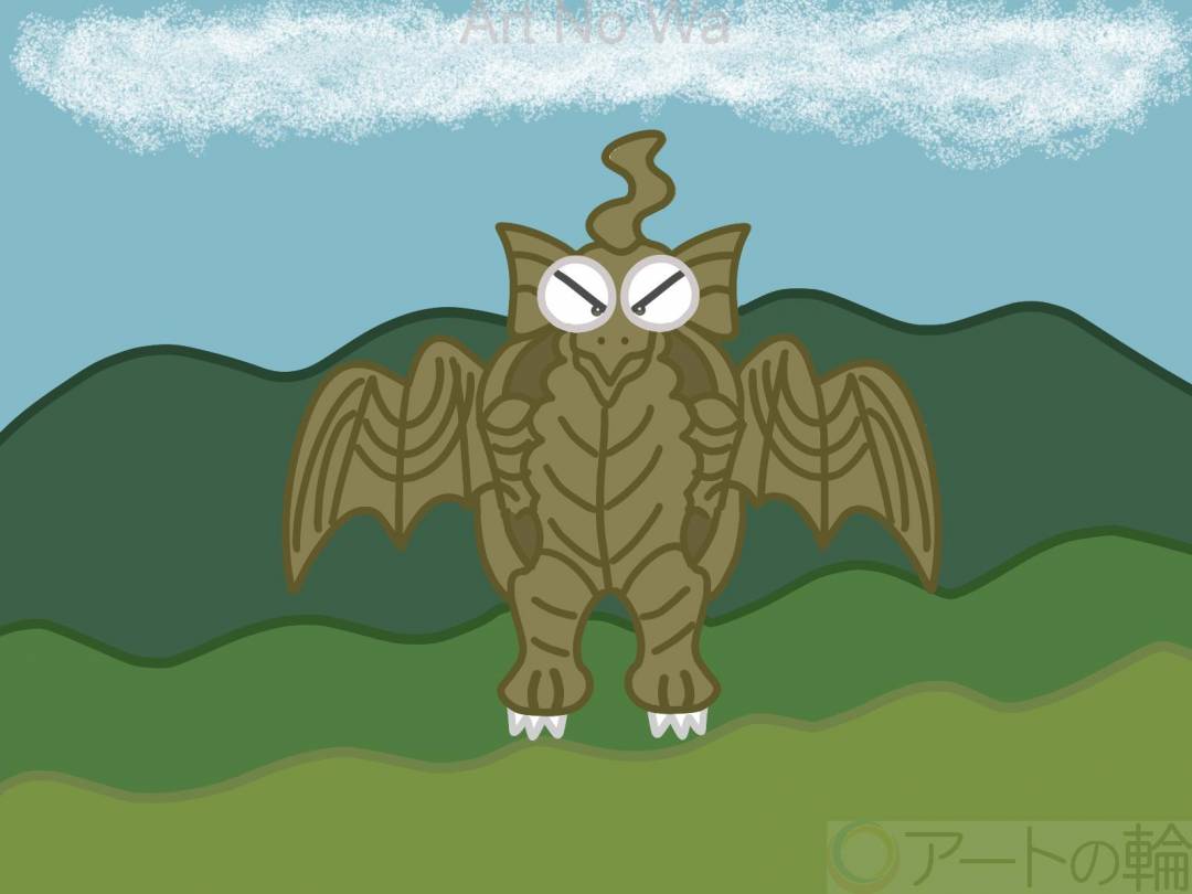 非現実,屋外,自然,山,空,緑,水色,白,黒,植物,想像上の生き物,風景,明るい,わくわく,どきどき,びっくり