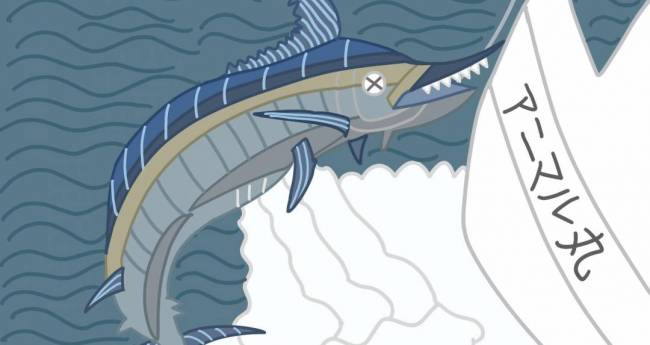 カジキマグロが船に釣られている所を描きました。芸術作品です。