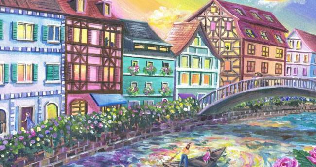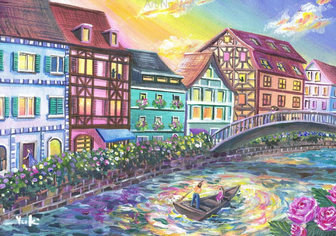 川のある街並みです。全体的に白を混ぜる事で、柔らかく、あたたかみのある絵になっています。柔らかな日差しで心安らぐ朝の始まりを、優しい雰囲気が出せる様に気を付けて描きました。
