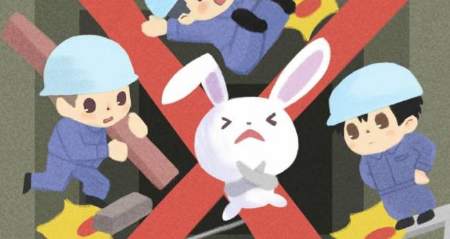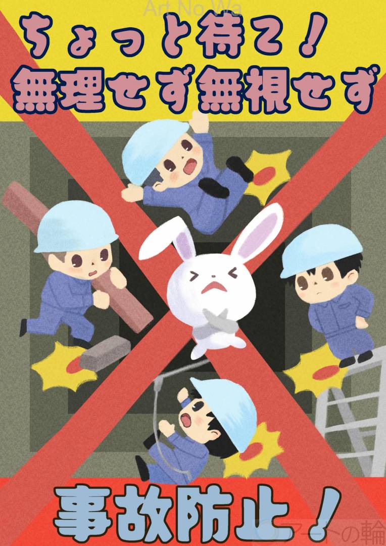 建設現場や作業場での事故をゼロにしたいという願いを込めて制作しました。作業に集中するあまり、つい無理をしたり、小さな危険を見逃したりしがちな瞬間を、ウサギのキャラクターが全力で「ちょっと待て!」と止めてくれるデザインにしています。中央に大きなバツ印とキャラクターを配置することで、「絶対ダメ!」というメッセージを強調しています。ポスターを見た人が「一歩立ち止まって確認しよう」と思えるような、やさしくも力強い啓発ポスターを目指しました。