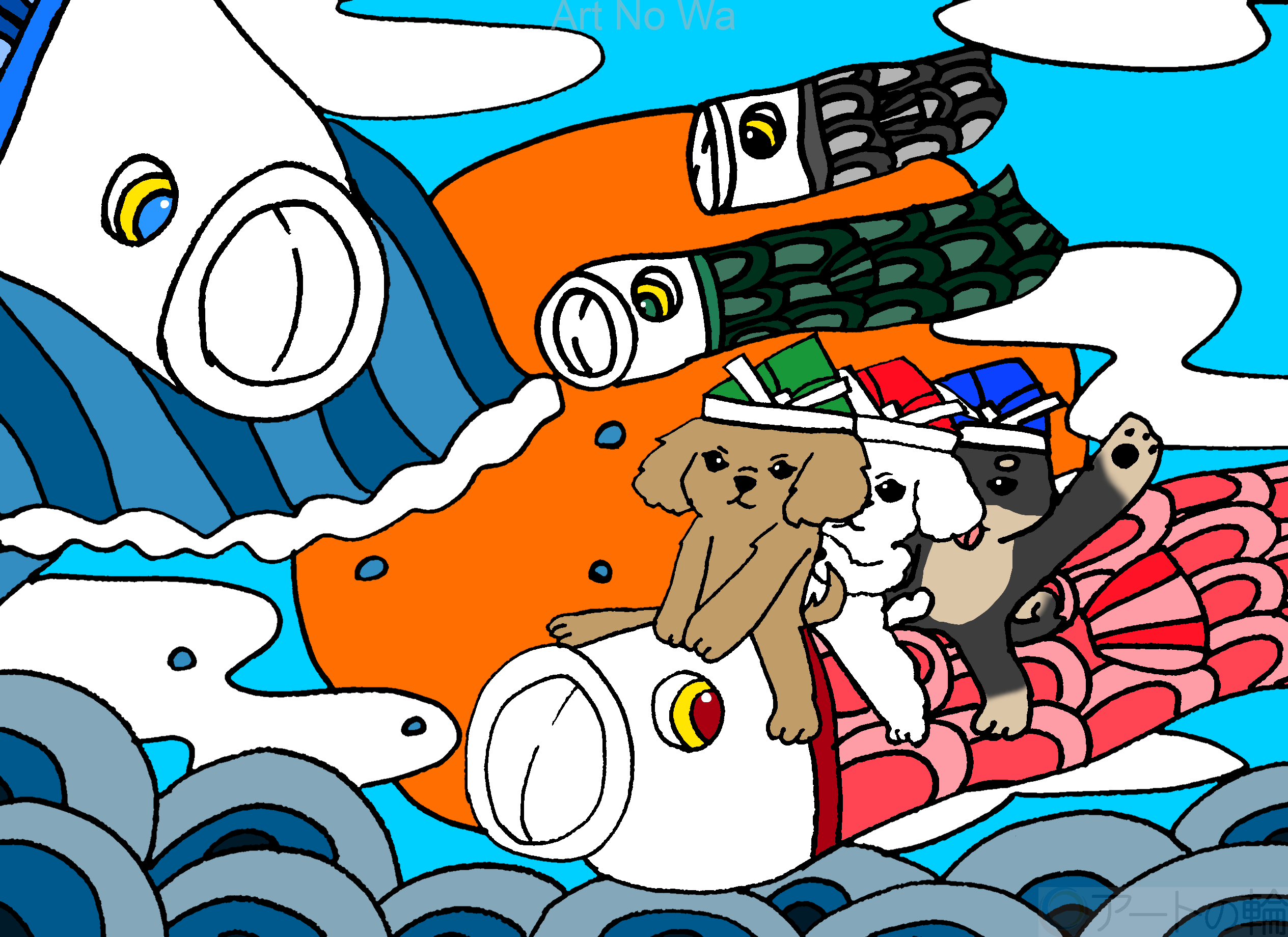 空と波を高く飛び越えて犬の男の子達を乗せて冒険している感じを描いてみました。