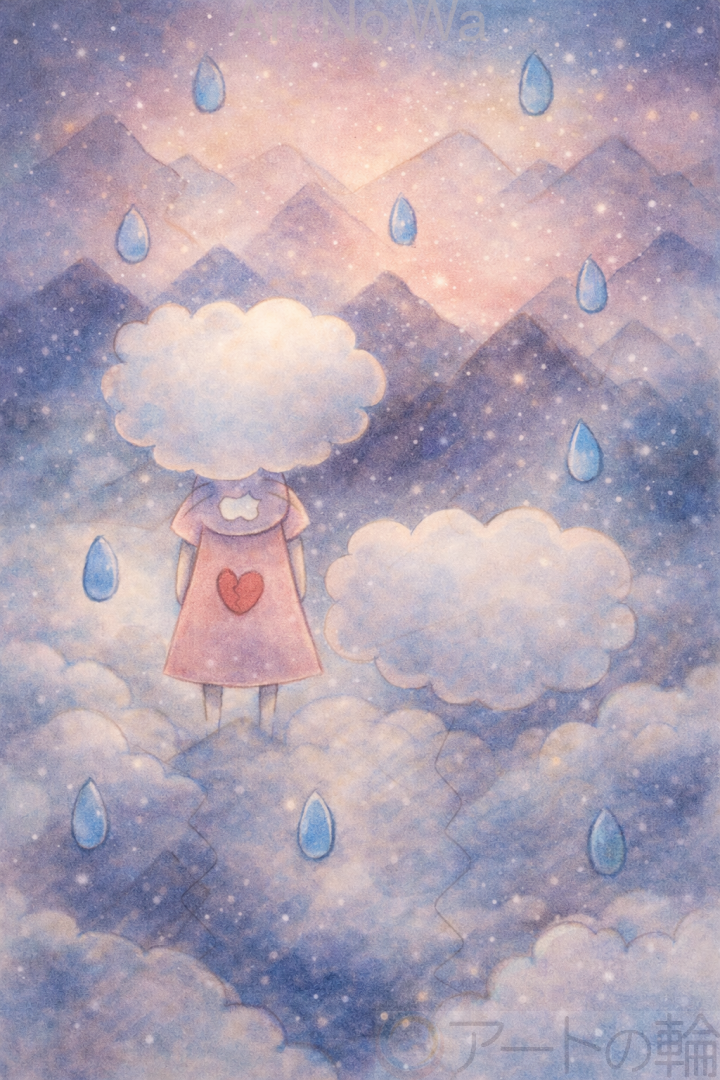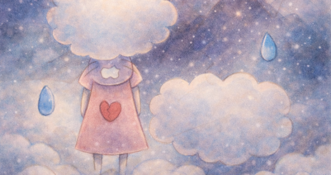 現実,非現実,過去,現在,未来,水色,青,紫,白,黒,人物,暗い