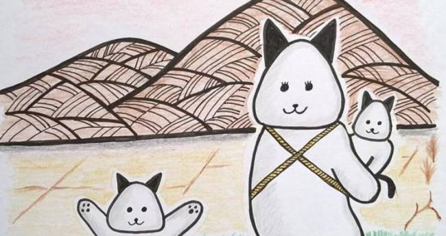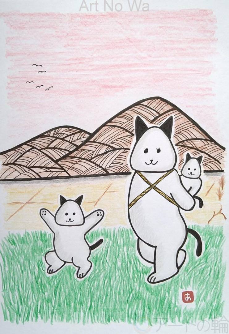 そのおむすび猫たちは若い頃の母、兄そして私のモデルとして描いていました。