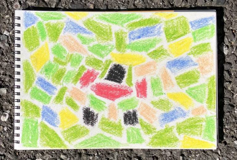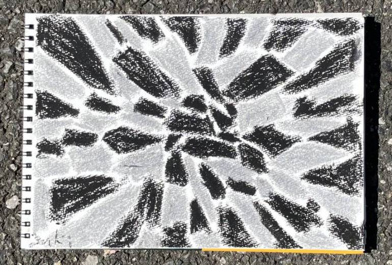 都営バスに乗って窓の外を眺めた風景を描きました。障害者年金を申請しに行って、書類を受け取ってもらえない絶望の中窓の外を見たぼんやりとした風景を描いています。生きることは難しいのに、窓の外は美しいと言われる風景が流れていきます。