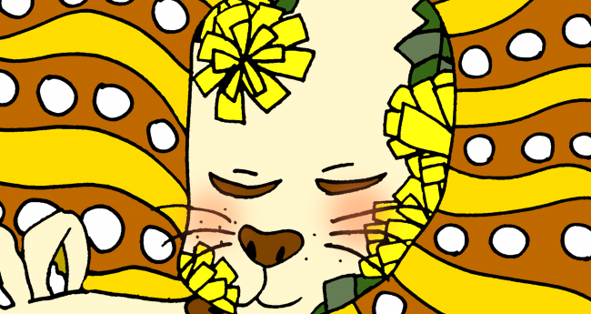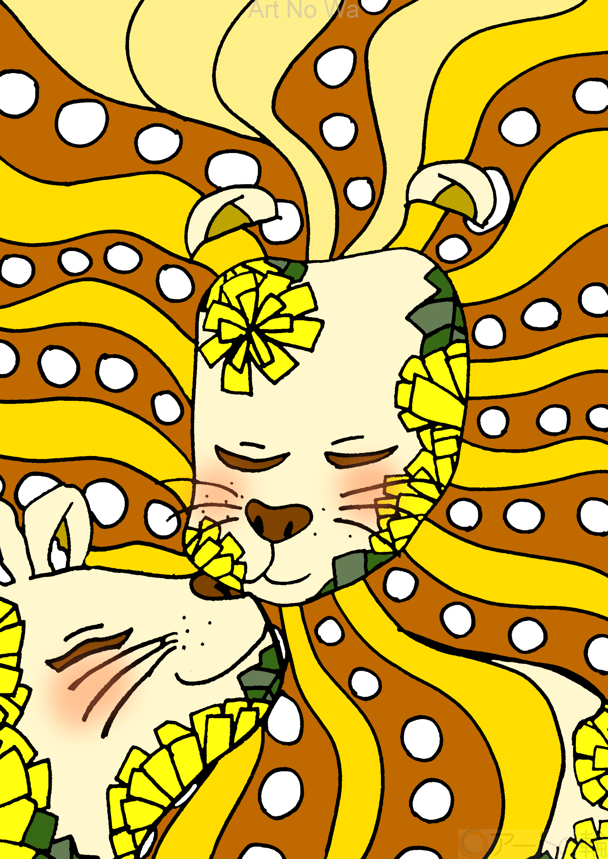 タンポポの花言葉「幸せ」とタンポポの花の外国語の「ダンデライオン」を掛け合わせて幸せそうなライオン夫婦を描いてみました。