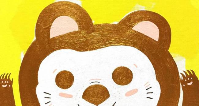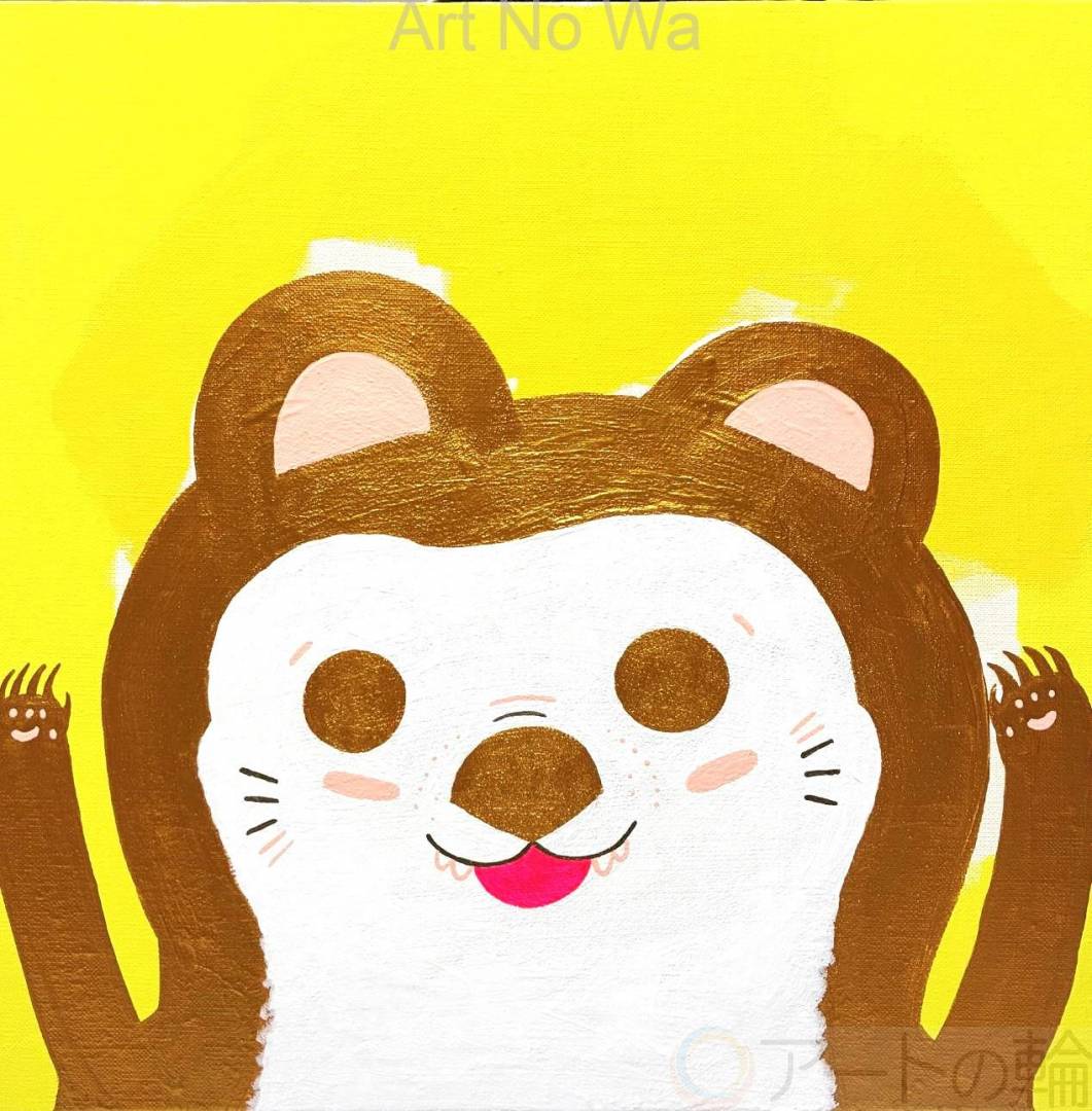 自作の物語のワンシーンを描いています。欲にまみれた人間をだまして、大好きなたぬきまんじゅうをたんまりと持ち帰って皆に自慢する狸さんを描いています。どこに飾っても狸がのぞきこむようにみえるかわいらしい作品です。