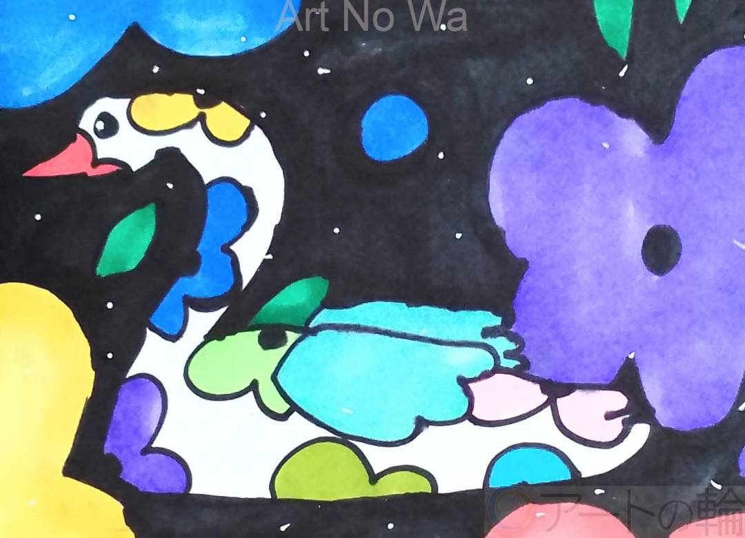 夜の暗闇の中輝いている花柄の白鳥を描いてみました。