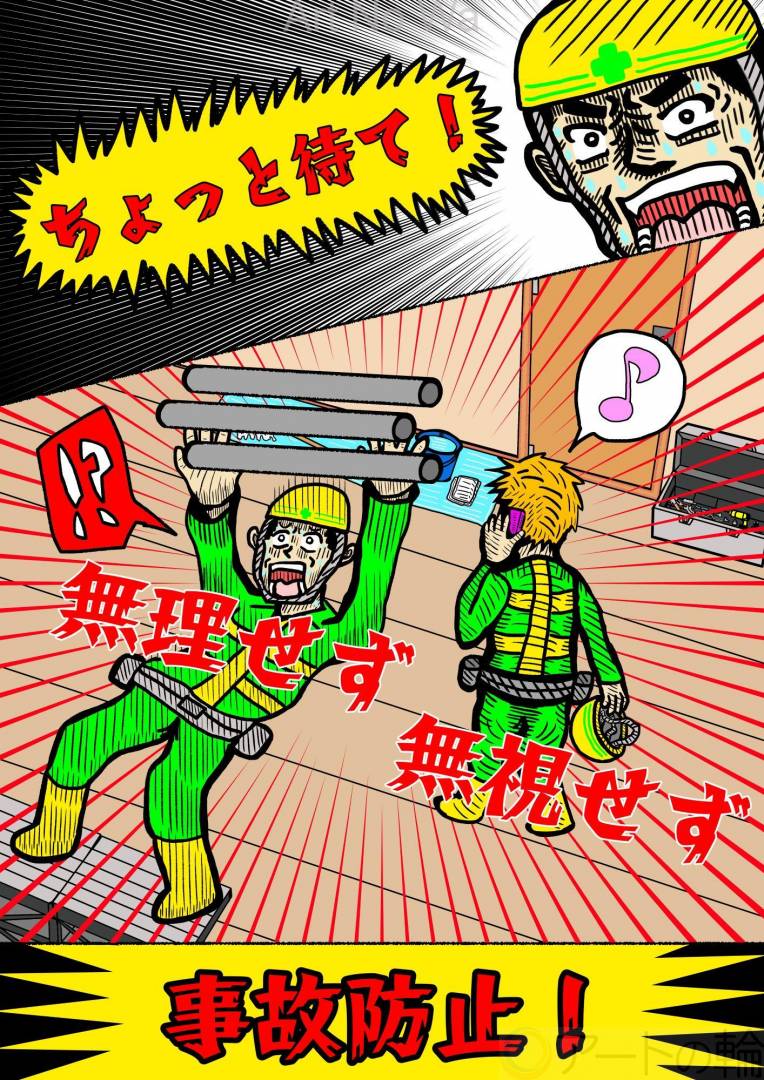 内装工事における事故の多くは、ほんの少しの焦りや慢心から起こり得るものと感じます。自分もハウスクリーニングの経験ではありますが、ハシゴから足を滑らせて、危うく窓の外へ落下しそうになったことをよく覚えています。事故を防ぐためには、何より立ち止まることが重要です。取り返しのつかない事態になる前に、待ったをかけてくれる存在が必要なのです。しかし全ての現場でそのような存在を求めるのは大変ですし、一人で頑張っている方もいます。なので一人一人の心の中に、イマジナリーの『おっちゃん』を作るのはいかがでしょうか。クドクドとお説教をする訳でも、ストレスのはけ口にする訳でもなく、ほんの一言『ちょっと待て!』と自分を思いやってくれる、そんなおっちゃんです。その一言を聴くだけでも、防げる事故はきっとあるはずです。…まぁ、おっちゃんが好みでないなら、イケメンの兄ちゃんや美人の姉ちゃんでもいいとは思いますが。