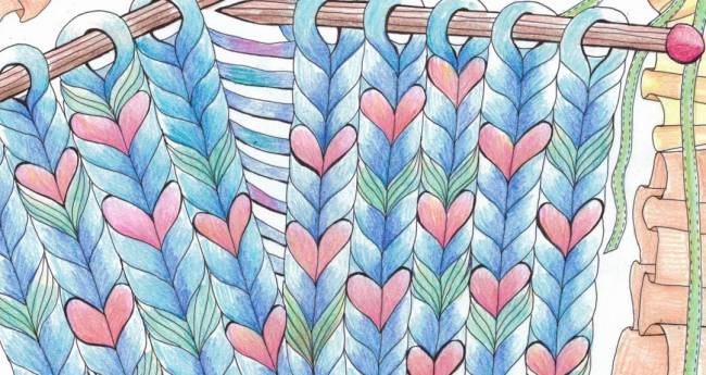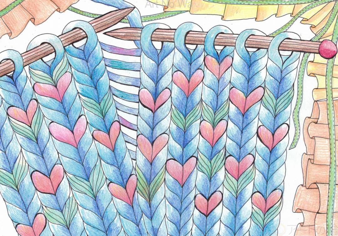 ハートは温かいイメージなので毛糸の温かさと相性がいいように思い組み合わせてみました。編み目の色を変えてハート模様を作っています。