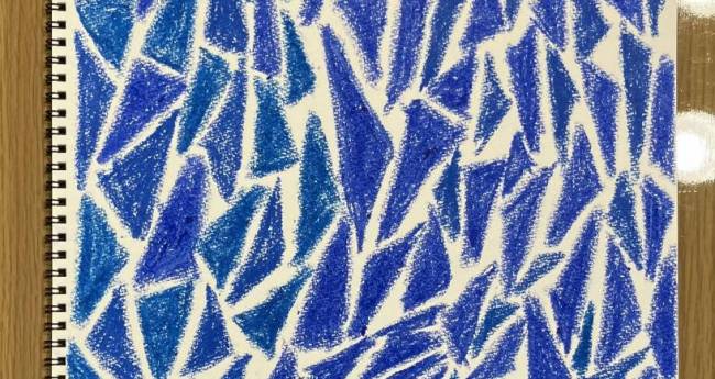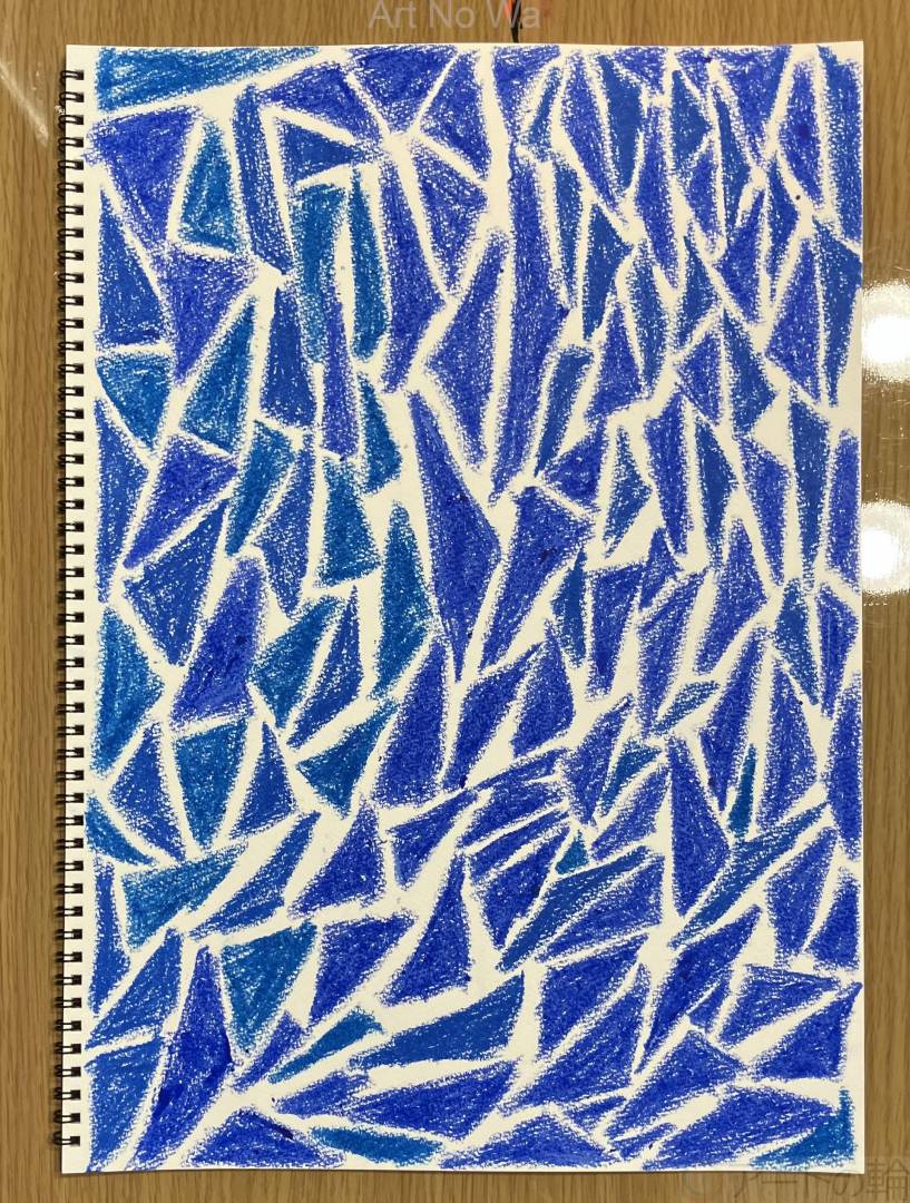 春になって溶けていく流氷を描きました。白い部分が溶けて固まって、青が透けて見えるようになる姿を描いています。