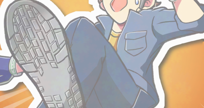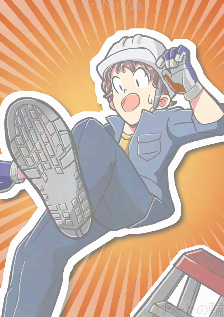 内装工事では転落事故が一番多いと聞いたので転落するところを描きました。リアリティがでて身近に感じていただけるように内装工事で使用する靴や手袋を調べて描きました。