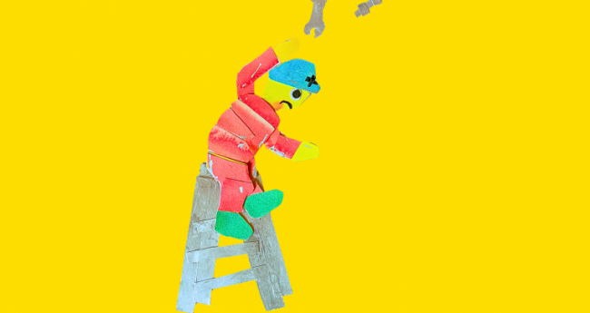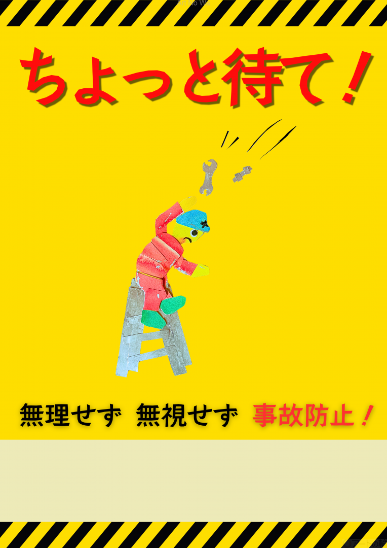内装事故防止と聞いて、脚立の上でバランスを崩しかけている人が頭に浮かびました 。上で作業している人の手が滑って工具が落ちてくる構図にしました。 私は、中途失明者ですが、視力があった頃、夫が使っていた脚立や工具を記憶してい ます。注意喚起の一助になれば嬉しいです。