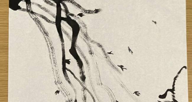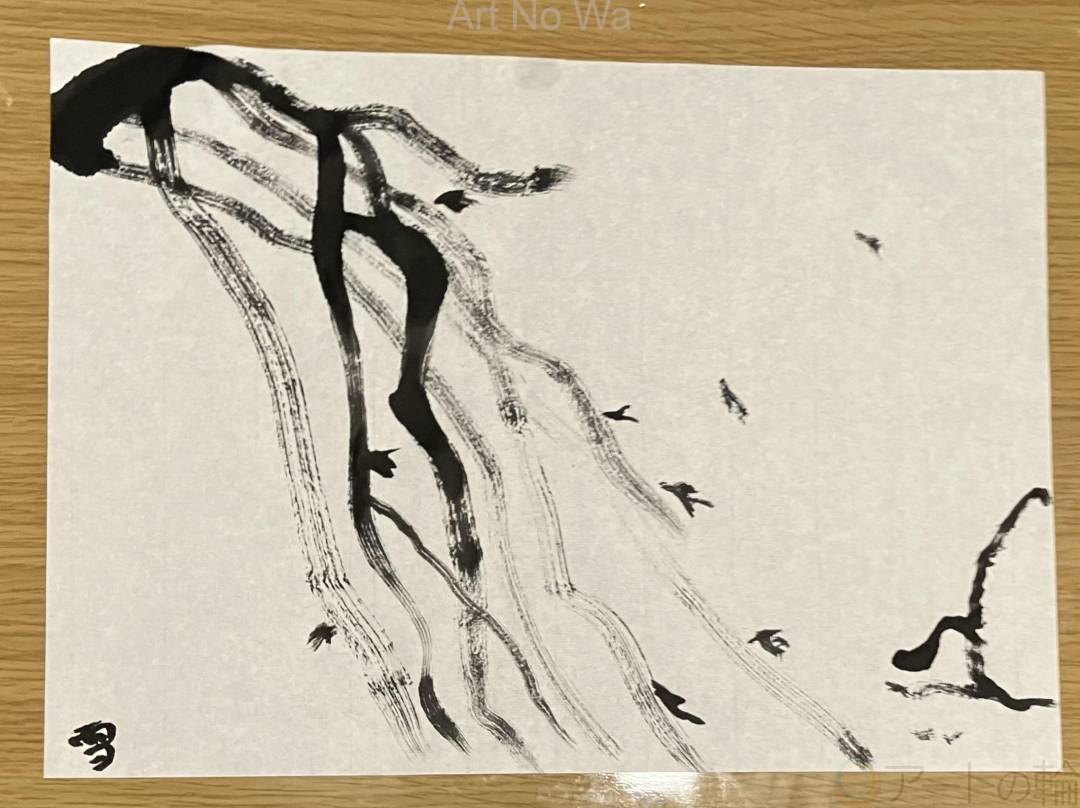 経済的困窮でご飯が食べられず、静かに餓死を待つ様子を枯れた梅で表現しました。手入れされず枝は地面まで延び、延びた先でかろうじてつけた花も咲くことはなく枯れて春風を受けて転がっていきます。お腹いっぱいご飯が食べたい。