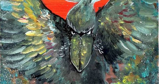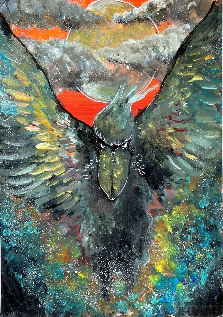 普段動かないハシビロコウが夕日を背に飛行する様子を描きました。迫力と色彩が自慢です。