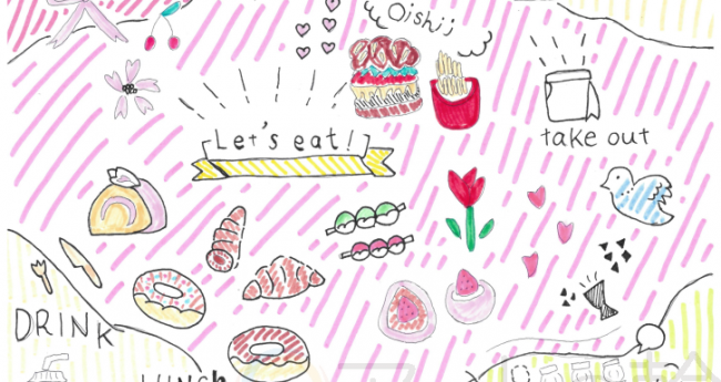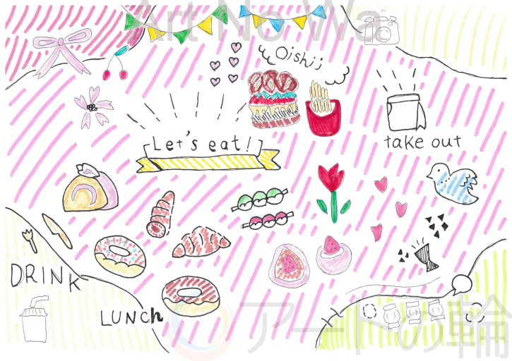 今回は、春のピクニックで、団子やパンなど食べ物を中心にイラストで描いてみました。春爛漫で、楽しい雰囲気を出してみました。